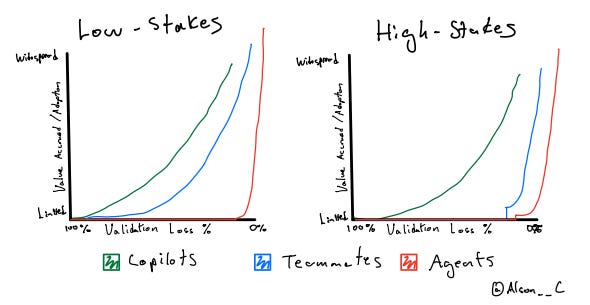 Here, considering low-stakes Copilots & Teammate models where all other features (UI, integrations, usability) ceteris paribus, the value accrued will follow a pretty obvious pattern: value accrued and adoption will depend mostly on dependability and validation loss %.