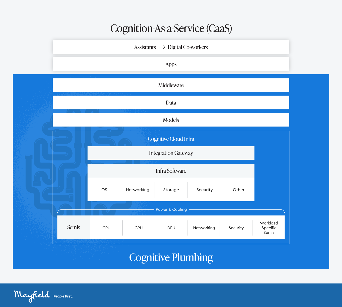 Mayfield Fund recently broke down the AI landscape into two frontiers: Cognition-As-a-Service (CaaS) and Cognitive Plumbing, the latter of which has recently taken off in terms of market cap, as realized through public market data.